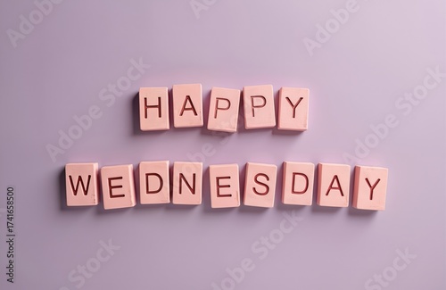Obraz premium Pink letter tiles spell Happy Wednesday words. Simple message on light purple background brings mid-week cheer, daily motivation, positive vibes. Bright greeting for digital content, social media,