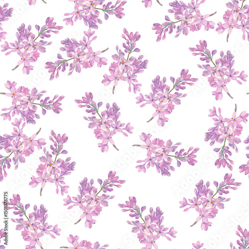 © Margarita, Obraz premium Pink lilac flower. Watercolor seamless pattern with lilac isolated on white background. Floral design template for wedding invitation, greeting card, notebook cover, flyer or certificate