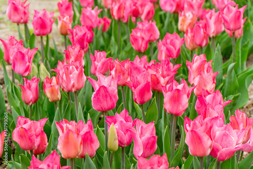 Fototapeta premium Pink Liliales tulip flowers blooming in flowerbed in garden on sunny day....