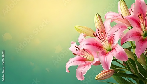 © Aodne, Fototapeta premium Pink lilies bouquet against a soft, light green and yellow background