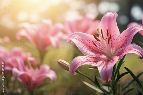 © Oleksandr, Fototapeta premium Pink Lilly in the Garden. A Closeup of Blooming Lilly in Vintage Morning Light amid Fresh Green Leaves - Nature Decoration for Spring and Summer Season