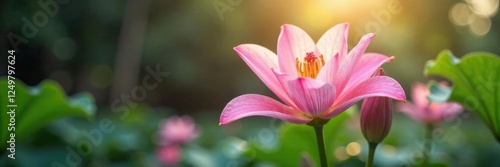 © Supharak wonginyoo, Fototapeta premium Pink lily blooms swaying gently in the soft light, light, gentle, soft