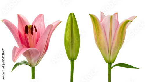 Fototapeta premium Pink lily buds at different blooming stages showing their development isolated on transparent background