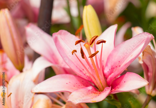 Fototapeta premium pink lily flowers on a flowerbed in summer