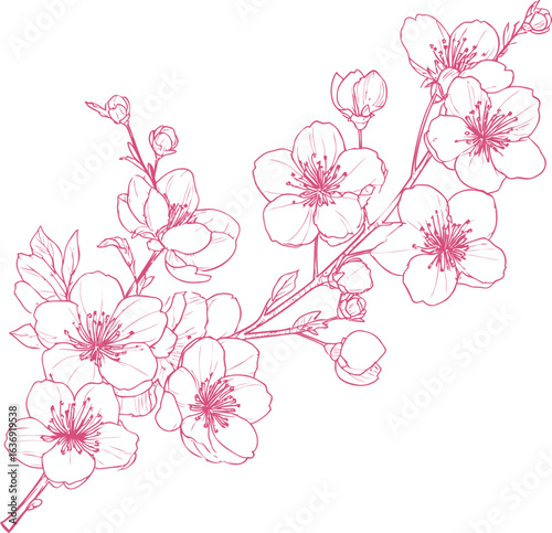 © Oksi, Fototapeta premium Pink line art of cherry blossoms branch in bloom, floral sketch. Vector illustration