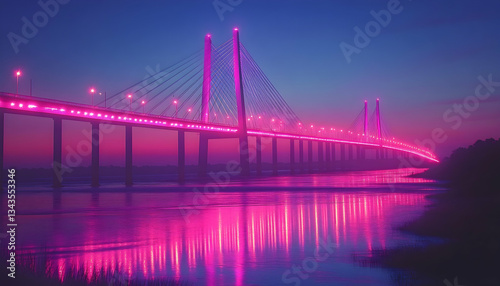 Naklejka premium Pink-lit cable-stayed bridge at dawn reflecting in calm water, misty atmosphere
