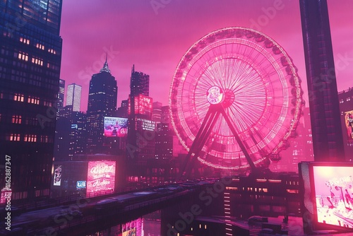 © BerkahStock, Fototapeta premium Pink-lit Ferris wheel at night in a futuristic city.