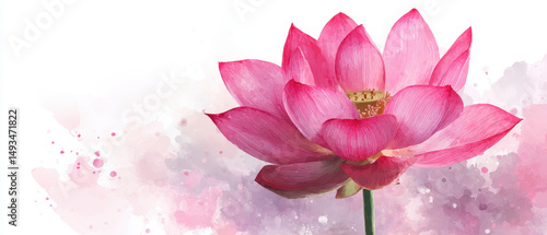 © Nittaya, Fototapeta premium Pink lotus bloom with watercolor splashes on white background