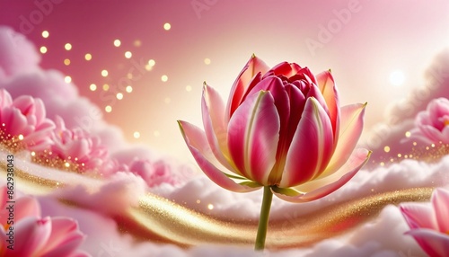 Fototapeta premium Pink Lotus Flower Surrounded by Pink Clouds and Golden Particles - Luxury...