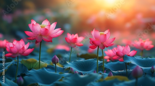 © Wayu, Obraz premium Pink Lotus Flowers Blooming in a Pond at Sunset