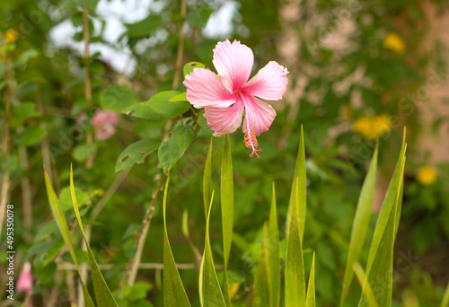 Fototapeta premium Pink macro hibiscus flower on blur green leaves background.