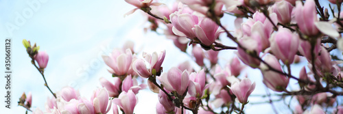 Obraz premium Pink magnolia amaizing spring blossom. Bright colorful flowers. Banner