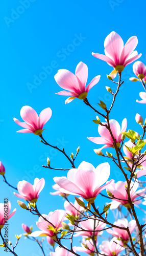 Fototapeta premium Pink magnolia blossoms against a clear blue sky, springtime beauty and nature's elegance, vibrant floral scene, vibrant, with white tones