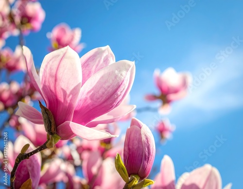 © Rahmayanti, Fototapeta premium Pink magnolia blossoms in full bloom against a bright, clear blue sky