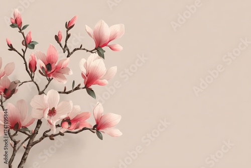 Obraz premium Pink magnolia blossoms on branches, a delicate spring floral motif and ample...