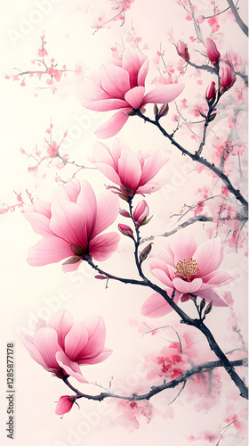 © Phoenixia, Obraz premium Pink Magnolia Flowers Blossom Oriental Style