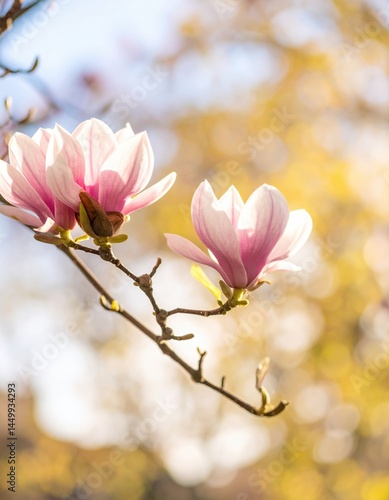 © Simon, Obraz premium Pink magnolias in bloom against a soft, sunlit background