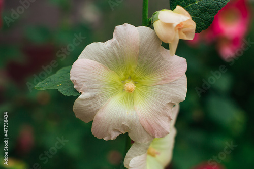 © Smile, Fototapeta premium Pink mallow flowers in a green yard