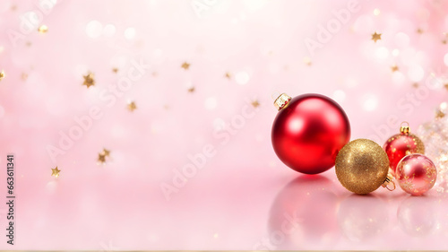 Fototapeta premium Pink Merry Xmas & Golden Happy New Year 2024 Wallpaper. Festive Christmas Baubles Banner. Seasonal Macro Photo with golden flakes bokeh Background and copy space