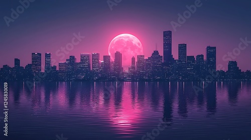 Fototapeta premium Pink Moonrise Over City Skyline Reflection