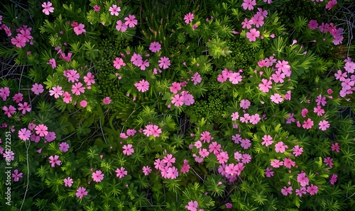 © simba kim, Naklejka premium Pink moss phlox seen from above in a spring flower garden, Generative AI
