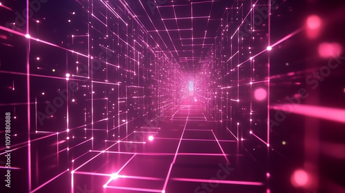 © Handz, Fototapeta premium Pink Neon Grid Lines Form Futuristic Corridor