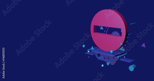 Naklejka premium Pink no entry road sign on a pedestal of abstract geometric shapes floating in the air. Abstract concept art with flying shapes on the right. 3d illustration on indigo background