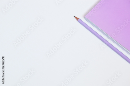 Fototapeta premium Pink notebook and pencil on white background. Selective focus