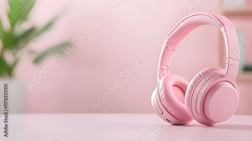 Obraz premium Pink over-ear headphones placed on a smooth pastel pink background,...