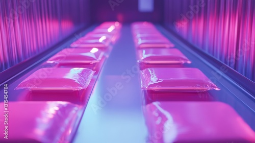 Obraz premium Pink Packages on Futuristic Conveyor Belt in Neon Light