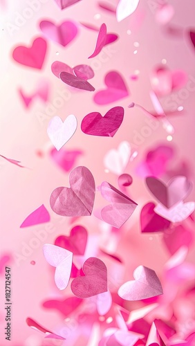 Obraz premium Pink paper hearts fluttering, romantic dreamy scene, light bokeh background