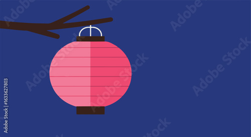 Obraz premium Pink paper lantern hangs from a brown branch, against a dark blue background