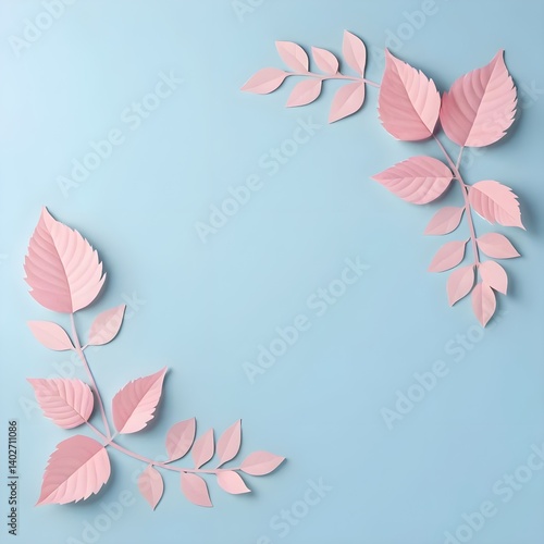 © ลลิดา ไชยศรีษะ, Fototapeta premium Pink Paper Leaves Frame on Light Blue Background