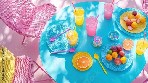 Fototapeta premium Pink patio, summer drinks, fruit, vibrant table setting