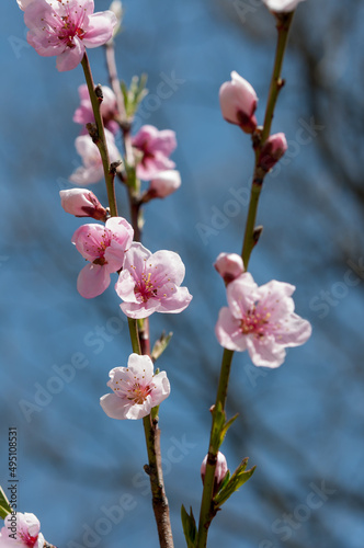 © eugen, Fototapeta premium pink peach buds and blossoms on a deep blue background