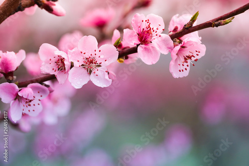 Obraz premium Pink peach flowers begin blooming in the garden. Beautiful flowering branch...
