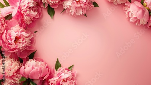 © The 2R Artificiality, Obraz premium Pink peonies wreath with paper on pink backdrop Top down view with room for text Elegant mockup for Valentine s or Mother s Day