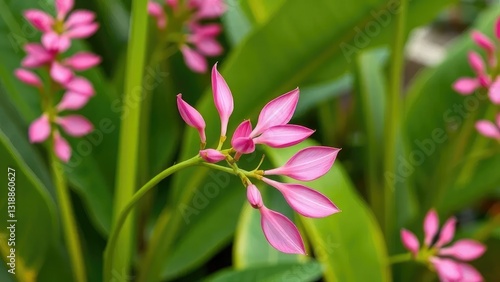 © Prapasarabhron, Fototapeta premium Pink petals on a green stem in a tropical garden, stems, pink