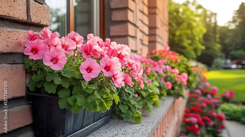 © MahmudulHassan, Fototapeta premium Pink Petunia Flowers in a Black Pot on Brick Wall With Sunlight and Greenery Background