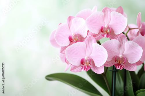 © Florian Dussart, Fototapeta premium Pink phalaenopsis orchids in full bloom with delicate petals and green leaves against a soft blurred background