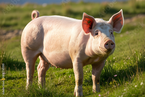 © Muhammad, Fototapeta premium Pink Pig Standing in a Grassy Field on a Sunny Day