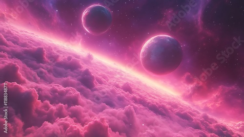 © Hambaa, Fototapeta premium Pink Planetary Cloudscape Two Moons Above
