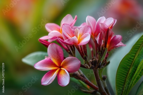 Fototapeta premium Pink plumeria blossoms against a green nature wall create a beautiful spa...