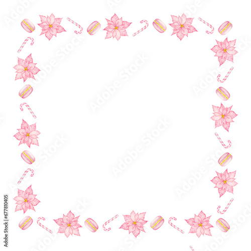 Fototapeta premium Pink poinsettia, New Year's candy canes, macarons. Watercolor hand drawn square frame with Christmas sweets. Winter symbols for holiday season prints for packing for pastry shop, bakery, invitations