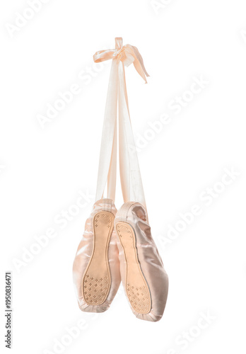 © Pixel-Shot, Fototapeta premium Pink pointe shoes hanging on white background, back view