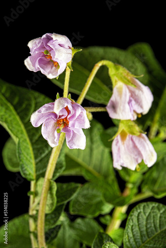 © kostiuchenko, Fototapeta premium Pink potato fliwers, isolated on black background