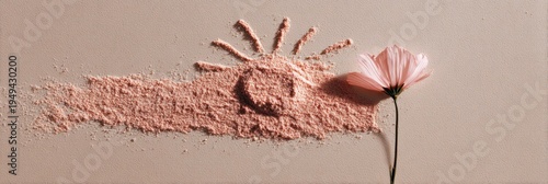 Obraz premium Pink powdered sun drawing single cosmos stem on neutral surface horizontal floral powder art composition