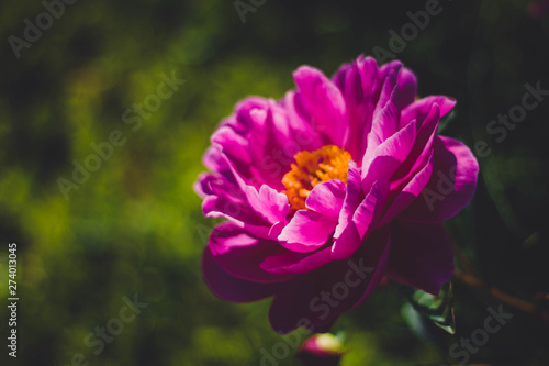 © Repli-Kate, Fototapeta premium Pink red peony with a yellow middle close-up on a background of green grass. Beautiful peony flower with large petals.