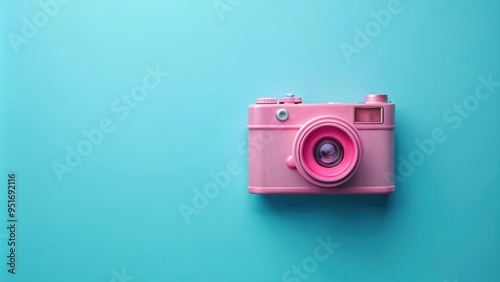 Fototapeta premium Pink retro camera placed on a minimal blue background, vintage, photography,...