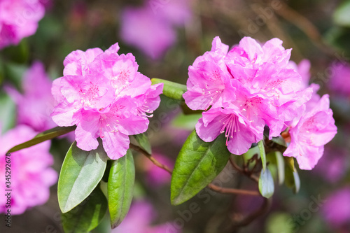 Fototapeta premium Pink rhododendron blossoms with a beautiful blur. Rhododendron hybridum.